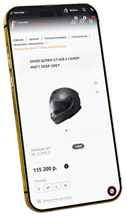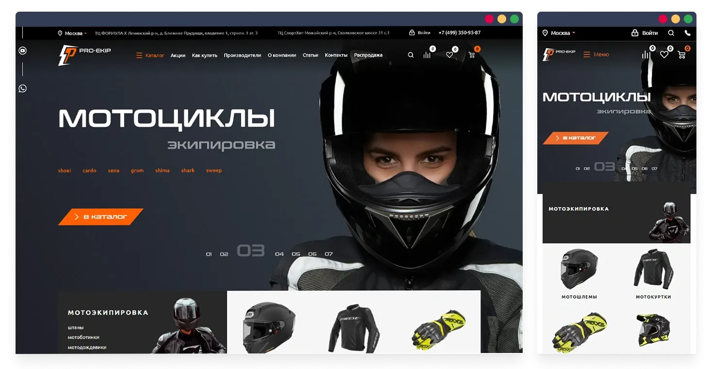 Основная задача – создать мультирегиональный сайт, так как продажа мотоэкипировки будет осуществляться в более чем 20 регионах. Разработать стильный, удобный и функциональный сайт, который будет выделяться среди конкурентов, а также наполнить товарами с других сайтов. Мы провели аудит, сравнили лидеров в конкурентной среде, выявили слабые стороны, разработали проект и приступили к его реализации.